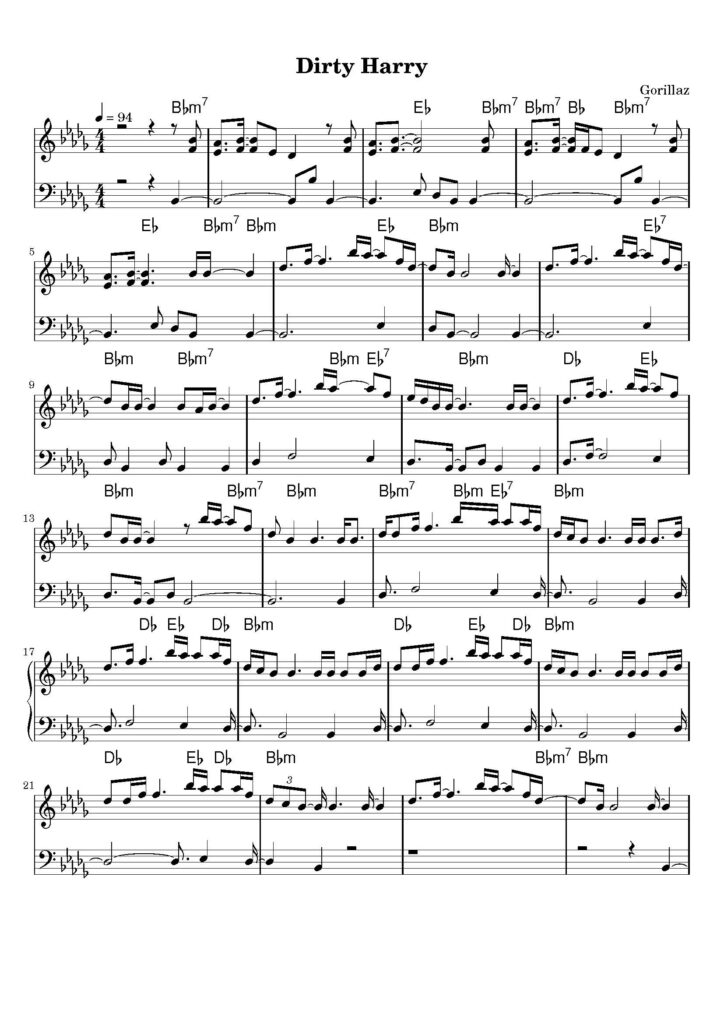„Dirty Harry” ukazał się na albumie „Demon Days” i wyróżnia się zdecydowanym, pulsującym rytmem, w którym słychać inspiracje muzyką elektroniczną oraz wpływy hip-hopowe. Specyficzna linia melodyczna dobrze sprawdza się w aranżacjach fortepianowych. Nuty zostały opracowane z myślą o pianistach na poziomie średnio-zaawansowanym. Zapis w formacie PDF zawiera czytelnie rozpisany układ dłoni, co ułatwi ćwiczenia i pozwoli na szybkie opanowanie kompozycji.
